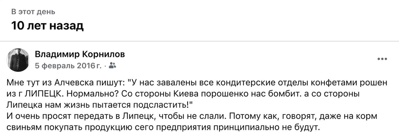 Владимир Корнилов: Вспомнилось вот. 10 лет назад жители Алчевска через меня просили передать в Липецк, что конфеты от Пети Порошенко не будут покупать даже на корм свиньям