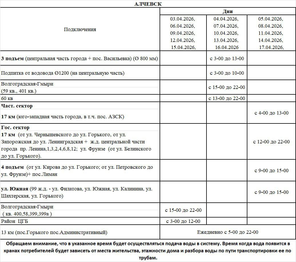 по причине нестабильного напряжения на объектах водоснабжения Алчевского управления вынуждено с 03.04.26 вводится ограниченный режим подачи воды на гг.Алчевск и Перевальск
